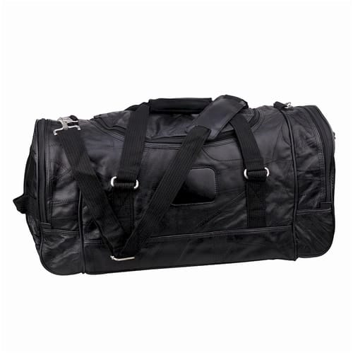 This 21" genuine black leather duffle/tote bag is made of 100% genuine leather. The patched leather is soft and comfortable giving a worn feeling from the moment you start using your new duffle bag. This quality leather duffle bag features ergonomic zipper pulls that easily glide open, padded handles, 4 no-slip feet on the bottom, and a detachable padded shoulder strap.
