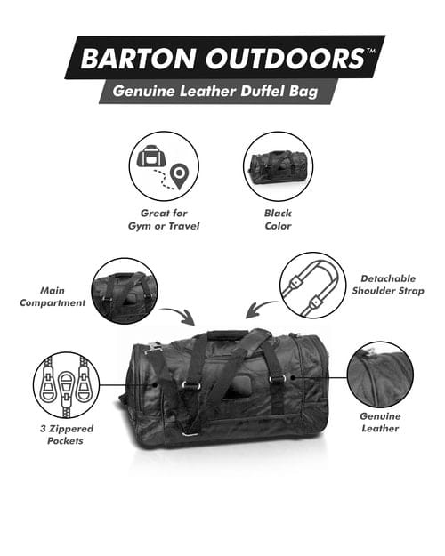 This 21" genuine black leather duffle/tote bag is made of 100% genuine leather. The patched leather is soft and comfortable giving a worn feeling from the moment you start using your new duffle bag. This quality leather duffle bag features ergonomic zipper pulls that easily glide open, padded handles, 4 no-slip feet on the bottom, and a detachable padded shoulder strap.