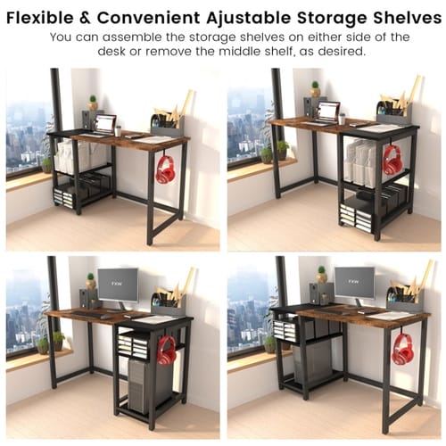 - ใStorage Function & Durabilityใ: The computer desks with shelf dimensions are 47.2"L x 23.6"W. The wide computer desk has two storage shelves, which can be mounted on either the left or right sides of the desk, according to your preference. The small top shelf is adjustable - install it in the upper hole to make room for a large computer tower. The two wooden boards are fixed on metal bars to ensure load-bearing capacity. The desktop is waterproof and anti-scratch and is very easy to clean.