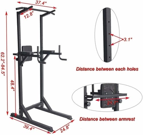 Multipurpose Dip Station Dimension: ( 62.2"- 84.5" ) H x 24.8" L x 39.4" W, Forearm cushion size: 3.9" W x 9.1"L, Backrest size: 9.4" W x 11.8" L