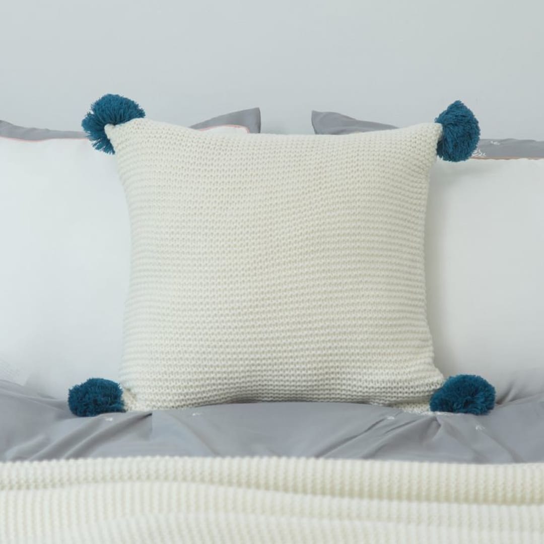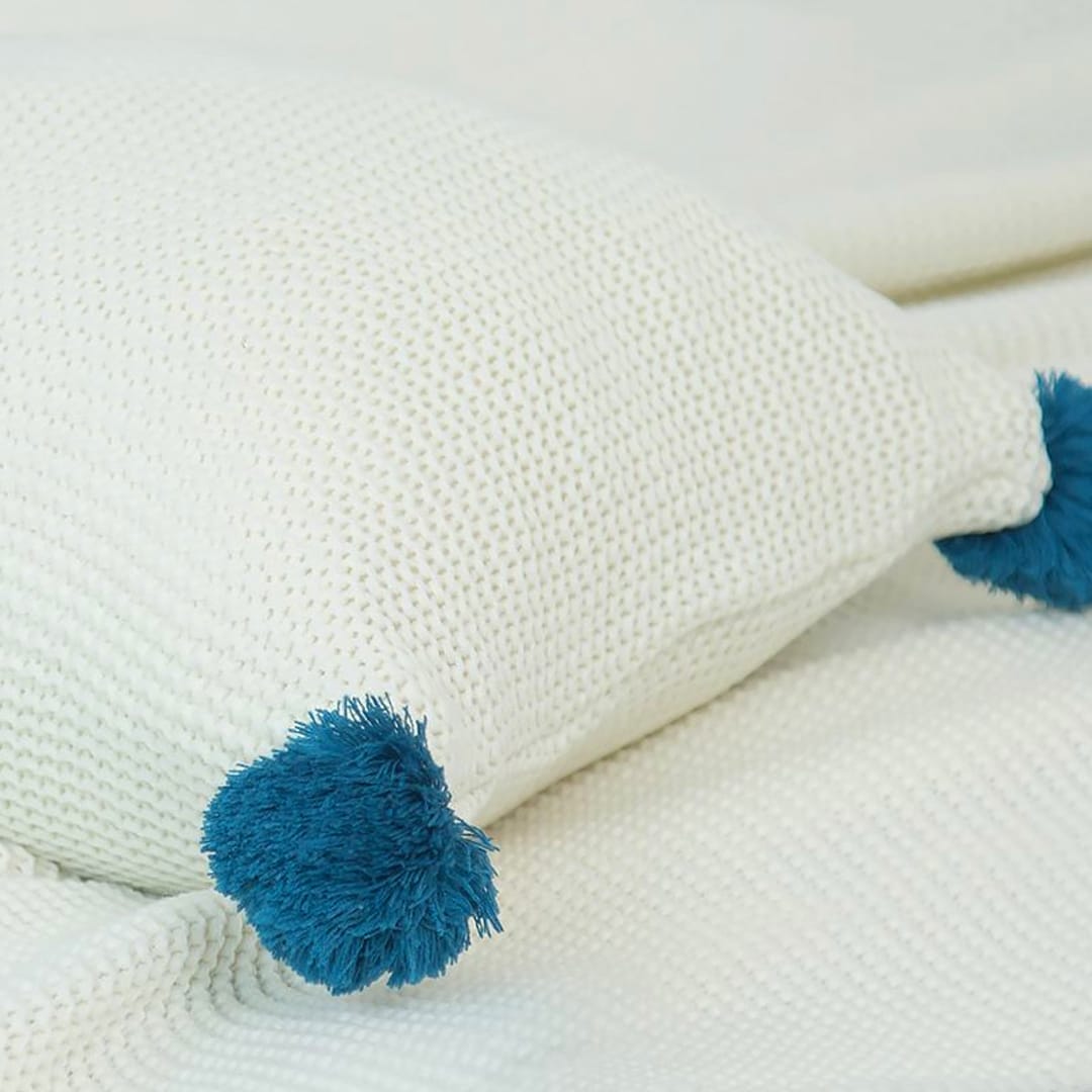 Achieve fresh modern elegance with these cream white ribbed knit pillowcase covers, accented by vibrant blue and yellow pom-pom corners that add a cheerful coastal charm to any space. The soft ribbed texture creates cozy visual depth, while the playful pom-poms bring a lively splash of color, perfect for brightening up your bedroom, living room, or reading nook. Ideal for those seeking a clean yet joyful aesthetic, these covers help transform your space into a relaxing seaside retreat while keeping your decor feeling modern and inviting.