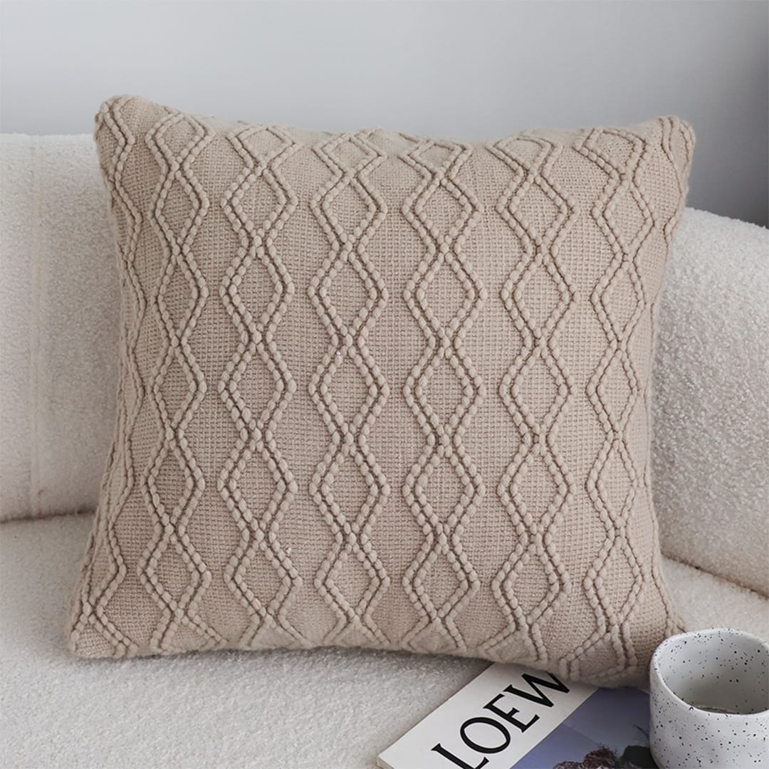 Create a warm, inviting atmosphere with this bundle of beige pillowcases featuring an intricate diamond cable knit pattern. The soft, neutral earth tone adds comfort and elegance to your sofa, bed, or reading nook while blending seamlessly with any dรฉcor style.